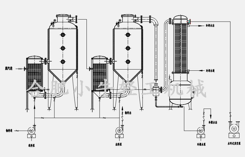 雙效外循環(huán)蒸發(fā)器(雙效濃縮器)主要由各效加熱器、各效分離器、冷凝器、冷凝液罐、真空泵、料液泵、閥門管路系統(tǒng)、電控系統(tǒng)組成。設(shè)備在運(yùn)行時(shí),料液進(jìn)入分離器及加熱器的管程,鍋爐蒸汽進(jìn)入一效加熱器的殼程,料液在真空狀態(tài)下沸點(diǎn)降低,當(dāng)受熱到一定溫度后沸騰,并從噴射管噴入分離器,進(jìn)行快速蒸發(fā)和汽液分離,未被蒸發(fā)的料液從底部循環(huán)管回流到加熱器再次噴入分離器,形成循環(huán)。由一效加熱器產(chǎn)生的二次蒸汽進(jìn)入二效加熱器作為加熱介質(zhì),得到熱能充分利用,從而實(shí)現(xiàn)節(jié)能效果。二效蒸發(fā)器內(nèi)的物料運(yùn)動狀態(tài)與一效同理,當(dāng)料液縮到一定的程度,經(jīng)取樣確定合格后即可出料。而產(chǎn)生的二次蒸汽進(jìn)入冷凝器殼程,被管程內(nèi)的冷卻循環(huán)水換熱冷凝成液相,進(jìn)入冷凝水收集罐,最后排出。